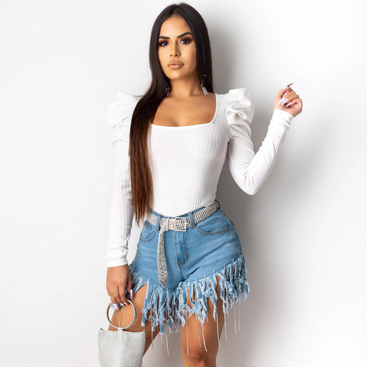 Fringed Chain Jeans Women's High Waist Slim Sexy Shorts European And American Style Heavy Industry Beading Tide