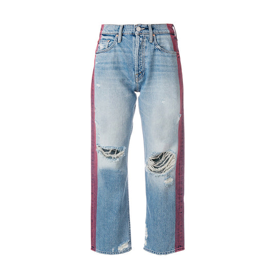 Spring and Summer 2021 New Trendy Sports Wind Printing Hole Washing Water Jeans New Women''s Seven-cent Trousers Straight Trousers