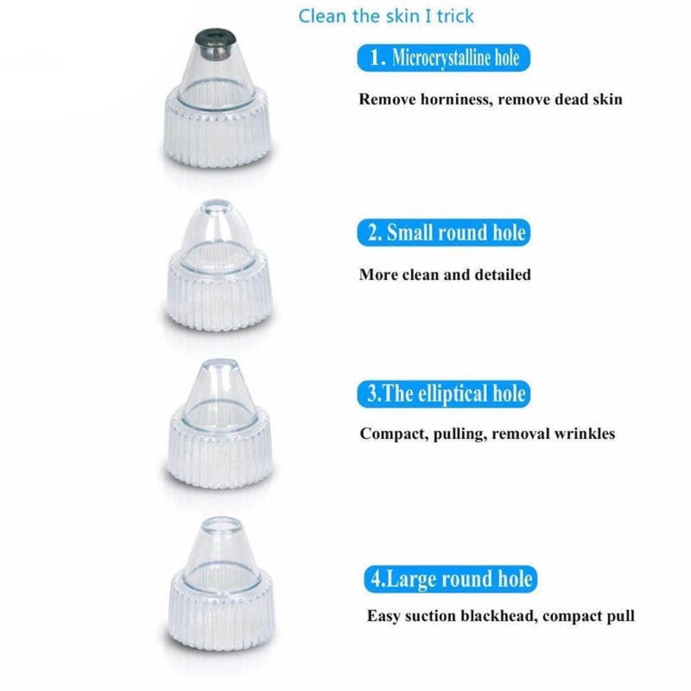 Blackhead Extractor:Thoroughly cleans blackheads, leaves no residue, and is not easy to regenerateSuction system, suitable for all kinds of face skin, deep blackhead removalPackage include 4 kinds of removal head, suitable for different problems of face skin.1 button, include 2grade adjustment power.Best gift for yourself, friends, lover & family.How to use a pore cleaner to blackhead to suck acne: