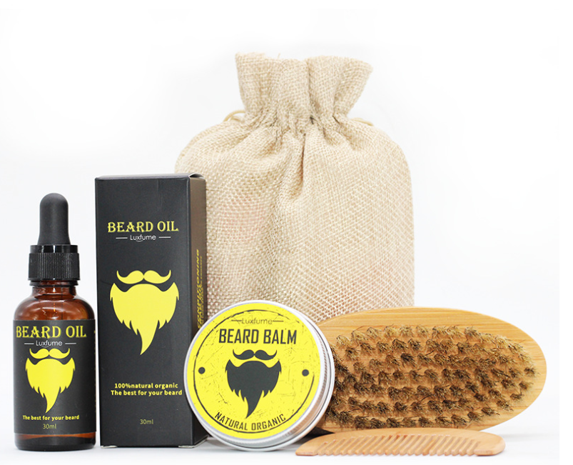 1*30ml beard oil, 30g beard cream, bristle brush, peach comb
