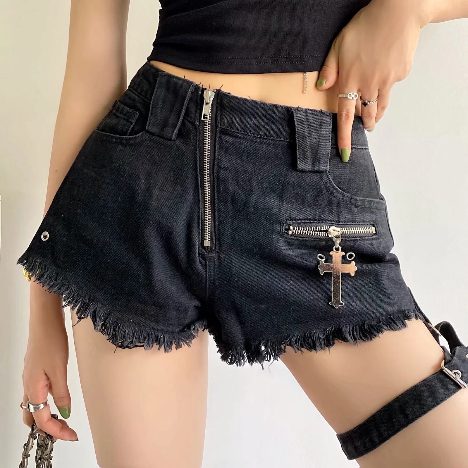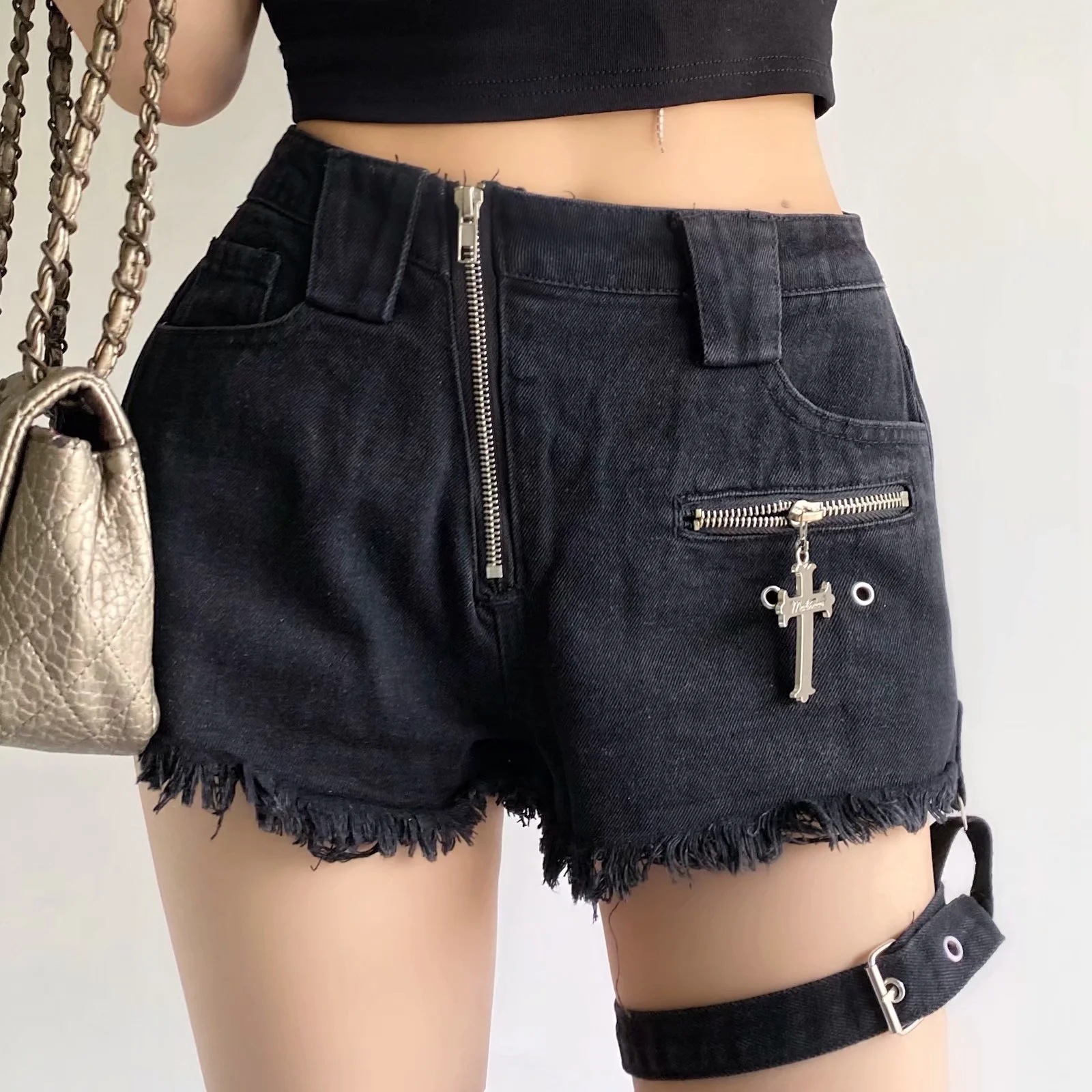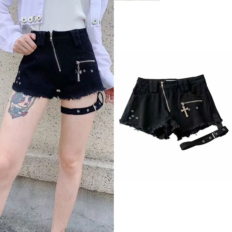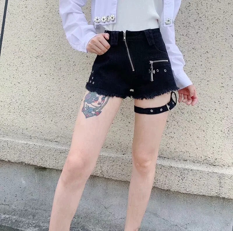 Zipper Design Denim Shorts Women High Waist Leggings