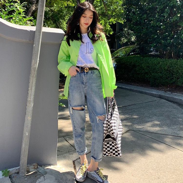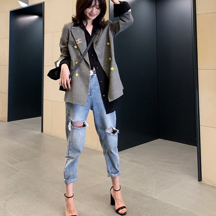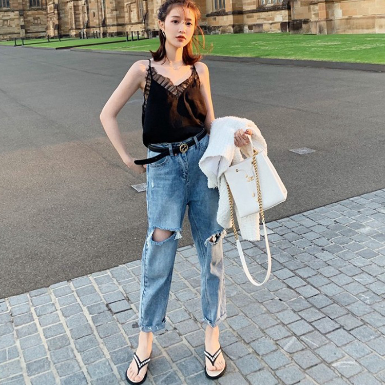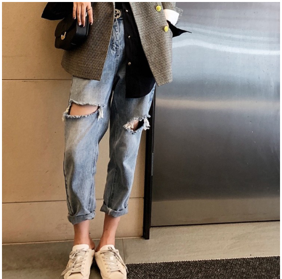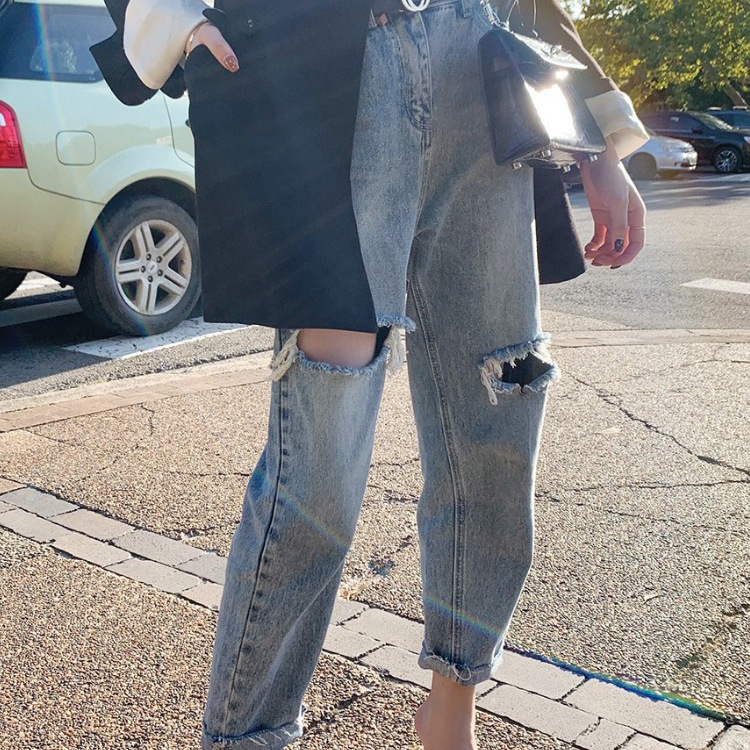 Spring new loose thin hole jeans women fashion personality light color feet pants